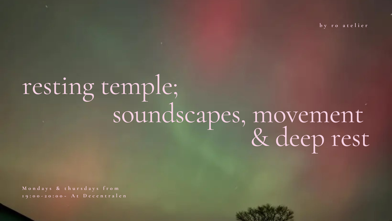 You can expect guided sound meditations inspired by deep listening alongside gentle embodiment practices such as breathing techniques, yin yoga, soft mindful movement, and occasionally free-form dance. There may also be sound-making, chanting, or the repetition of tones to support and awaken a calm, meditative presence. Verbal guidance is kept minimal. Guidance will be offered in Danish, and English will be used when needed.